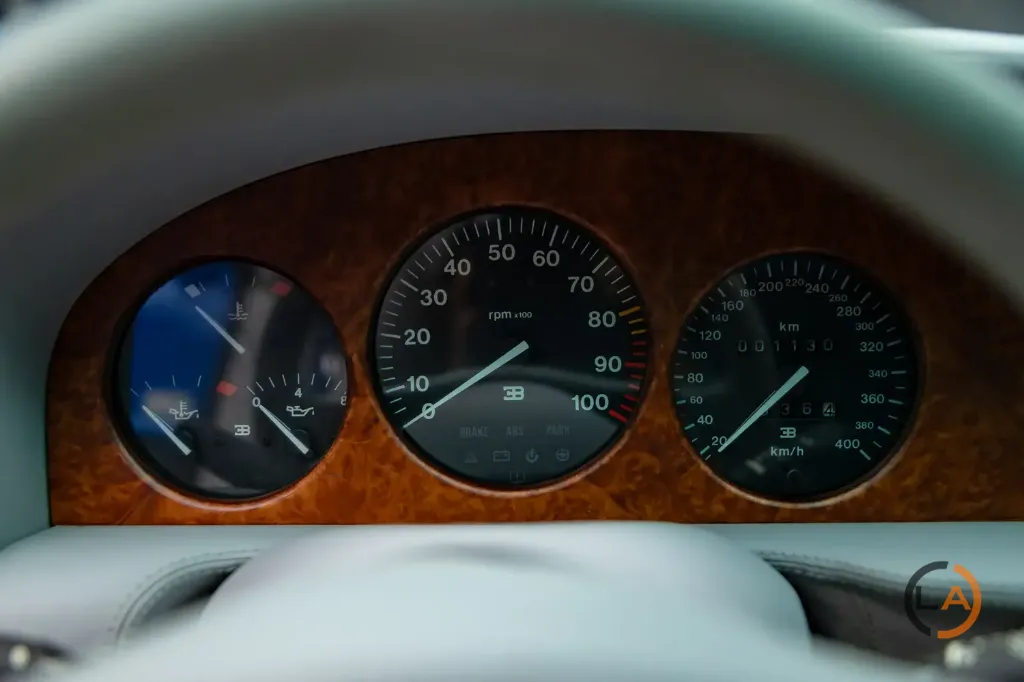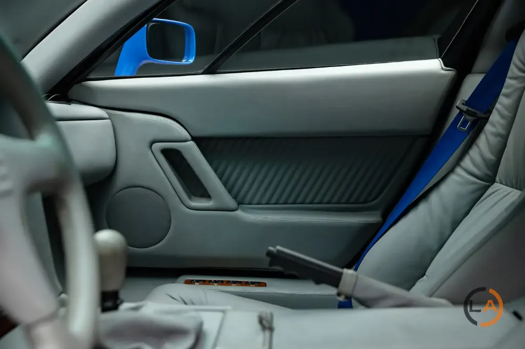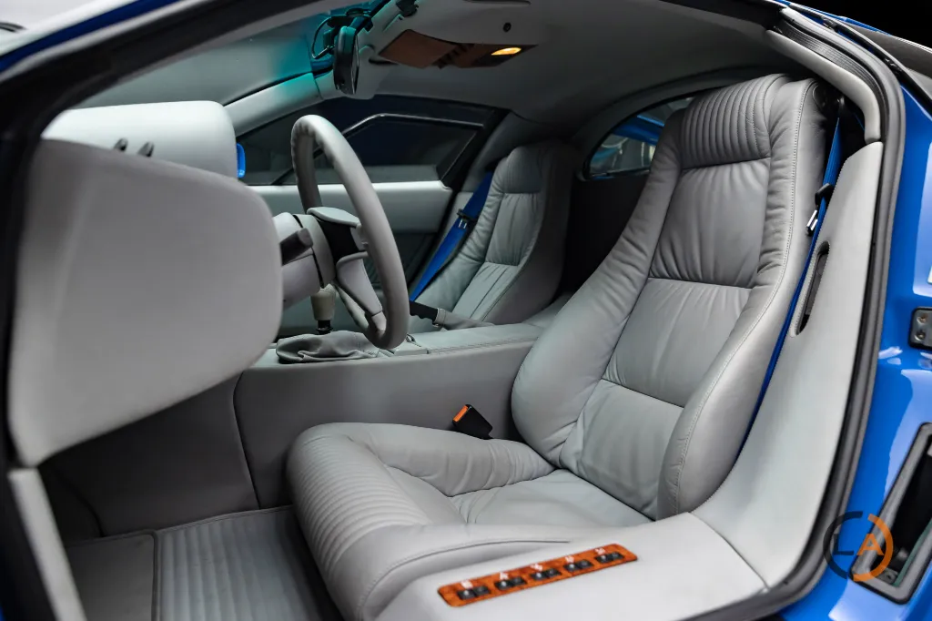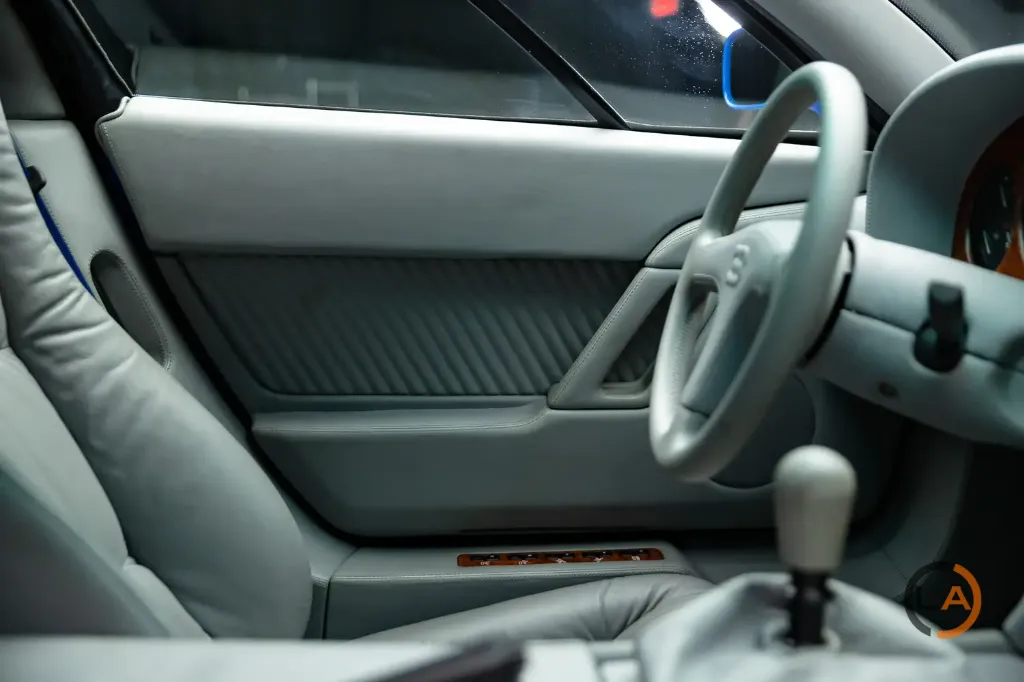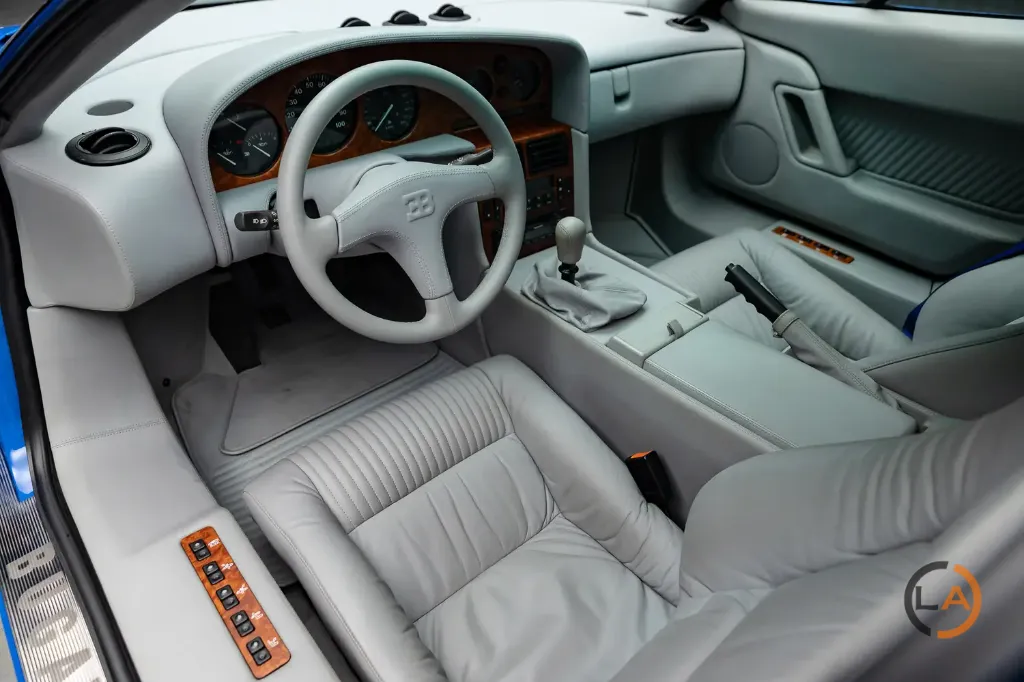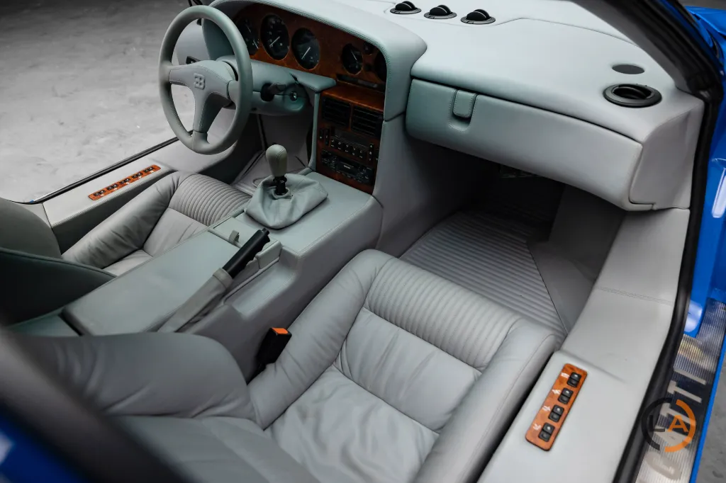 Ten egzemplarz jest wykończony w kolorze Bugatti Blue na skórzanym wnętrzu Grigio i ma przebieg zaledwie 1130 kilometrów od nowości. Jeden z najniższych przebiegów EB110 GT, jaki znamy, pozostaje w pełni oryginalny i nie był restaurowany.
